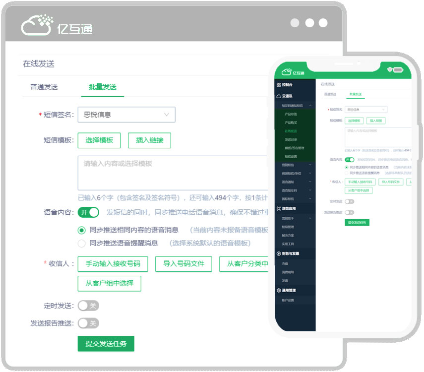 短信發(fā)送平臺網(wǎng)頁版,無需安裝軟件,高效網(wǎng)頁版自助式平臺,支持PC和手機端操作。